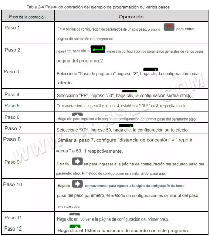 ● Al completar la programación de varios pasos, debe volver al paso inicial antes de iniciar el sistema;de lo contrario, el programa comenzará a procesar la posición en el paso actual.