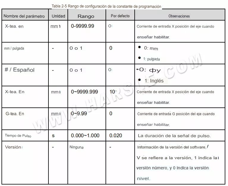 El rango de configuración de la constante de programación se muestra en la Tabla.